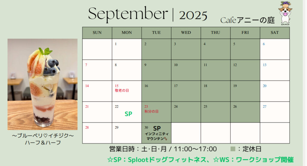 9月のCafe営業カレンダーです。詳しくは「こちら」をクリックしてください。