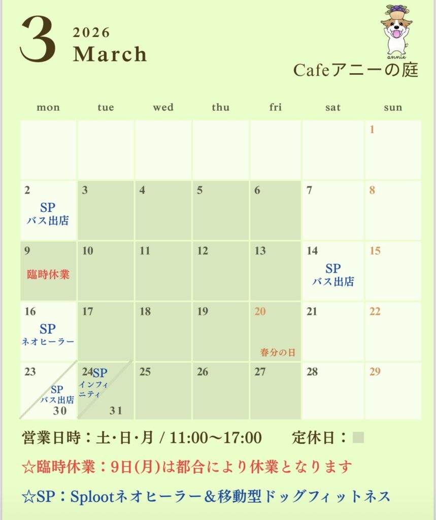 3月のCafe営業カレンダーです。詳しくは「こちら」をクリックしてください。