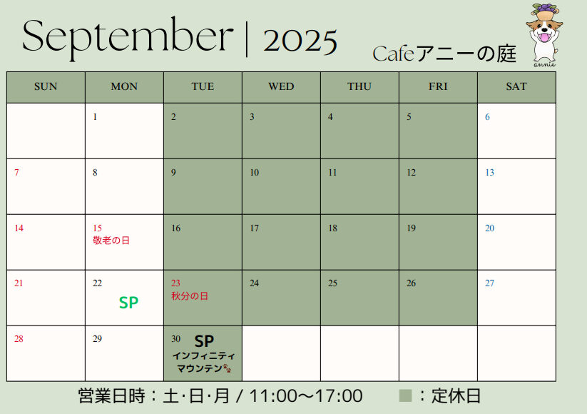 9月のCafe営業カレンダーです。詳しくは「こちら」をクリックしてください。